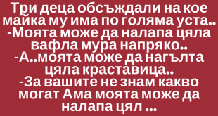 Три деца обсъждали на кое майка му има по голяма уста.. -Моята може да налапа цяла вафла мура напряко.. -А..моята може да нагълта цяла краставица.. -За вашите не знам какво могат Ама моята може да налапа цял телевизор…. Погледнали го ококорени очи другите…. -Да бе!!! Всяка вечер чувам тате да и казва…гаси телевизора и го лапай …… 🙂 🙂 🙂 …