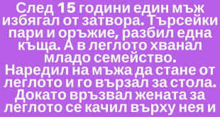 След 15 години един мъж избягал от затвора. Търсейки пари и оръжие, разбил една къща. А в леглото хванал младо семейство. Наредил на мъжа да стане от леглото и го вързал за стола. Докато връзвал жената за леглото се качил върху нея, целунал я по врата и отишъл в банята. Докато крадеца бил в банята, съпруга прошепнал на жена си: …