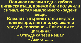 Полицаи влезли в една хубава циганска къща, понеже били получили сигнал, че там имало много крадени вещи. Влезли на първия етаж и видели телевизори, лаптопи, музикални уредби, телефони… Попитали те циганина: – Откъде са тези неща? – От къде да знам? Сигурно детето ги е намерило до кофите с боклук и ги е домъкнало в къщи. Качили се на втория …