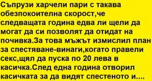 Съпрузи харчели пари с такава обезпокоителна скорост,че следващата година едва ли щели да могат да си позволят да отидат на почивка.За това мъжът измислил план за спестяване-винаги,когато правели с*кс,щял да пуска по 20 лева в касичка.След една година отворил касичката,за да види колко са спестили.Резултатът го озадачил: –Жена,винаги когато правехме с*кс,пусках в касичката по 20 лева,но тук има банкноти от …