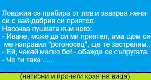 Ловджия се прибира от лов и заварва жена си с най-добрия си приятел. Насочва пушката към него: – Иване, може да си ми приятел, ама щом си ме направил “рогоносец”, ще те застрелям… – Ей, чакай малко бе! – обажда се съпругата. – Че ти така както си тръгнал да застрелваш за такова нещо, скоро ще останеш без нито един …