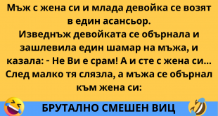 Мъж с жена си и млада девойка се возят в един асансьор.Изведнъж девойката се обърнала и зашлевила един шамар на мъжа, и казала:– Не Ви е срам! А и сте с жена си…След малко тя слязла, а мъжа се обърнал към жена си:– Скъпа, честна дума! Нищо не съм направил!Жена му:– Знам! Аз я щипнах по д*пето. 🙂 🙂 🙂 …